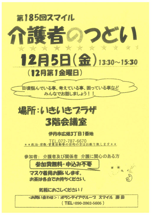 講座・イベント 第185回スマイル 介護者のつどい ▼ご案内▼ 開催日時:12月5日(金)13:30~15:30 場所:いきいきプラザ 3階会議室 参加費・申込:不要 tagPlaceholderカテゴリ: