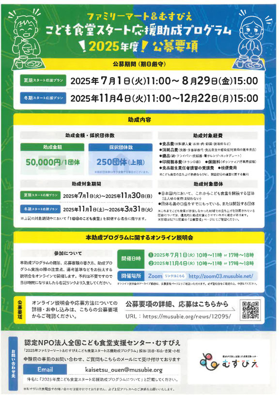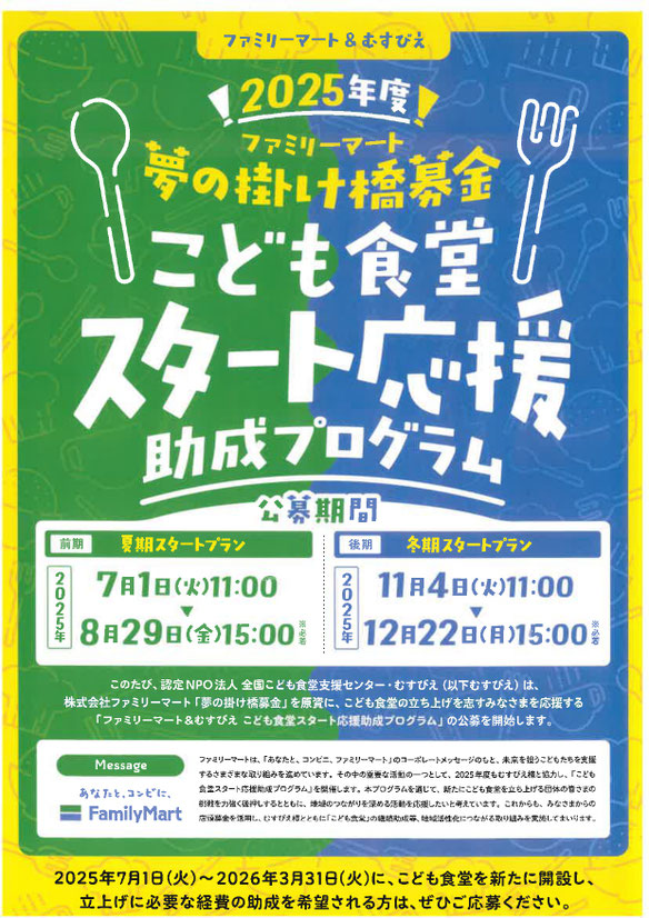 本プログラムはファミリーマートとむすびえが協働で立ち上げた「ファミリーマート むすぶ、つながるこども食堂応援プロジェクト」が、その一助になればと願いを込めて実施するものです。