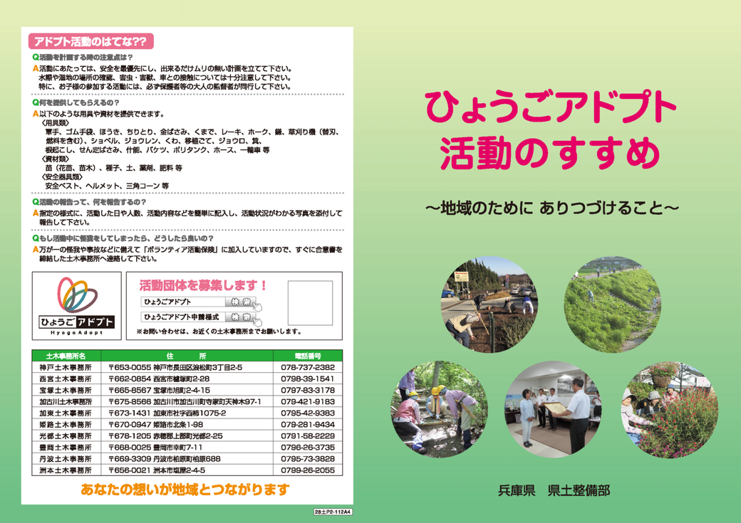 助成金情報 ひょうごアドプト活動 県が管理する河川、道路、砂防施設、港湾、海岸等(活動区域)において、みなさんがボランティア等(清掃美化活動)を行う際に、県・市町が用具の提供等を行い支援する制度です。 整備の内容としては、清掃や草引きの他、花苗の植栽なども対象で、整備する地域の広さや規模に応じて道具や花苗・土・肥料・資材などの物資を県が提供します。 詳しくはHPをご覧ください⇒https://web.pref.hyogo.lg.jp/ks04/wd03_000000040.html tagPlaceholderカテゴリ:
