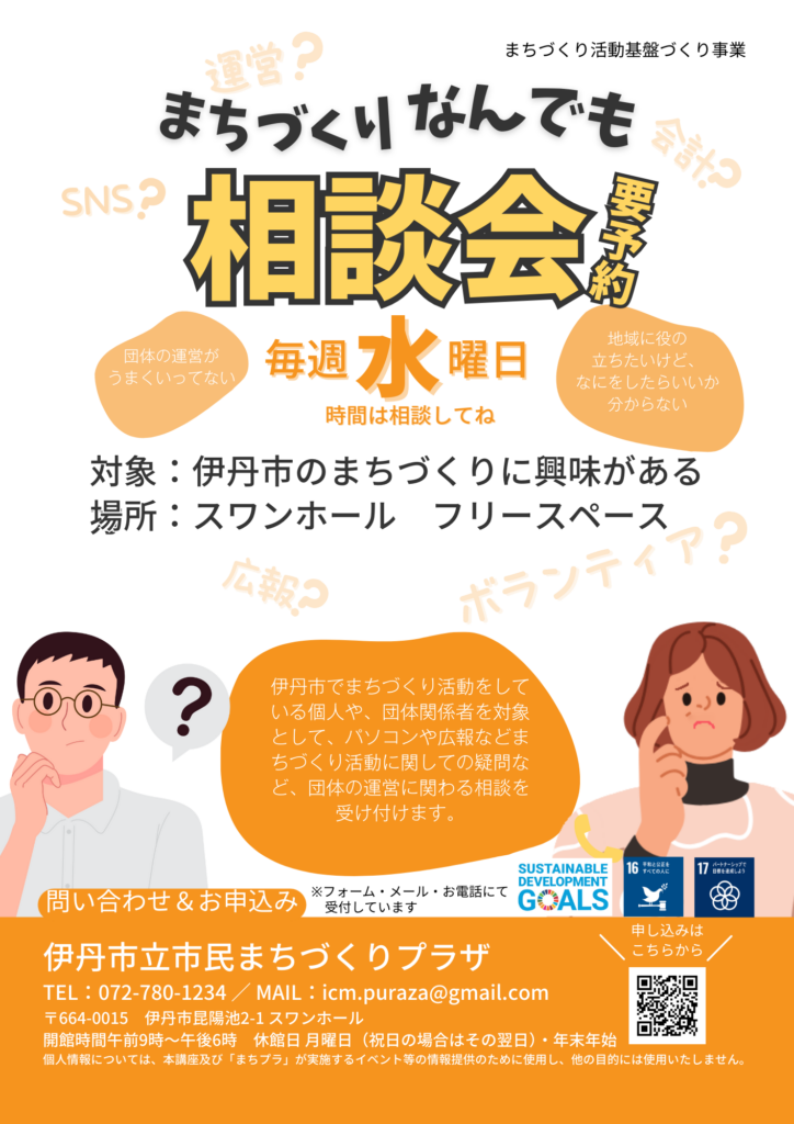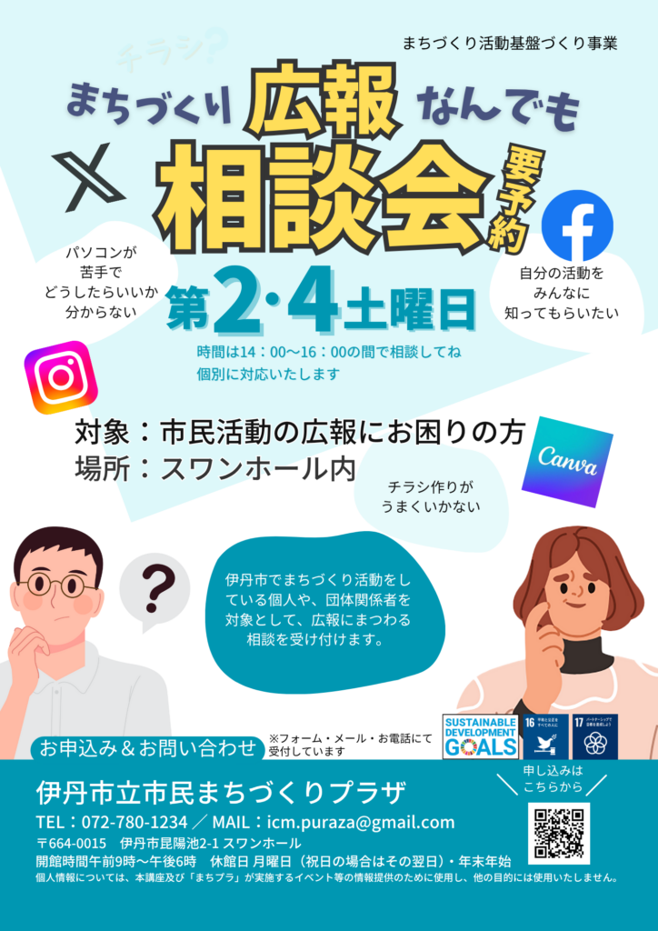 伊丹市でまちづくり活動をしている個人や、団体関係者を対象として、 広報にまつわる相談を受け付けます。 例えば・・・ ・パソコンが苦手で、どうしたらいいか分からな...日時 毎月第2・4土曜日(要予約)、時間は14:00~16:00の間でご相談ください。 場所 スワンホール1階 まちプラ窓口 参加費 無料 主催 まちプラ -