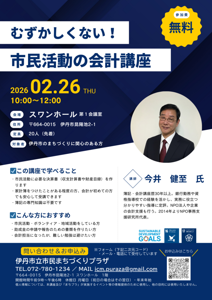 ・市民活動に必要な決算書(収支計算書や財産目録)を作ります ・家計簿をつけたことがある程度の方、会計が初めての方でも安心して受講できます ・簿記の専門知識は不...日時 2/26(木) 10:00~12:00 場所 スワンホール1階 第1会議室 参加費 無料 主催 まちプラ -