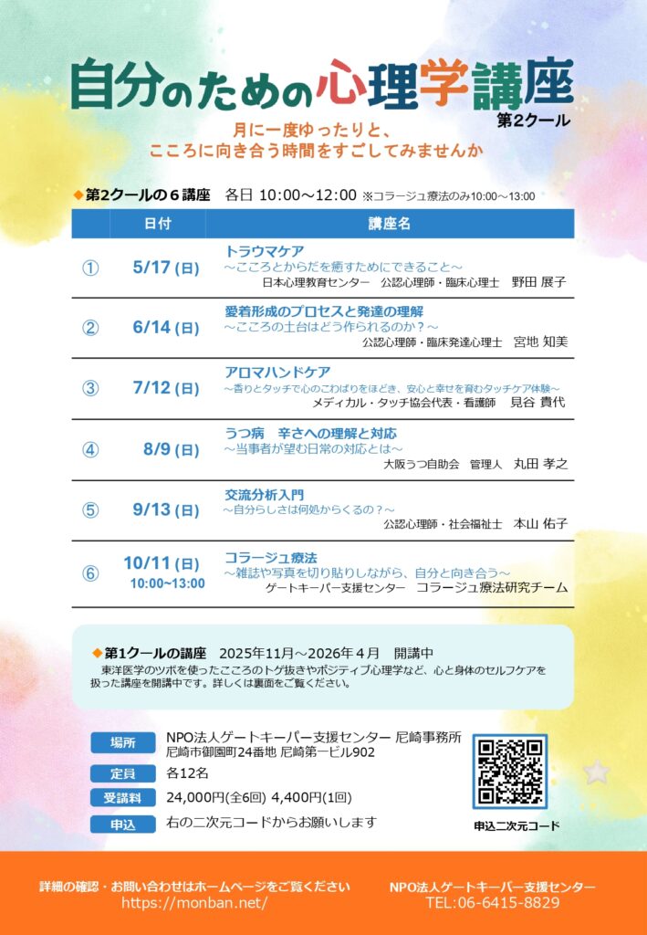 日時 5/17(日)、6/14(日)、7/12(日)、8/9(日)、9/13(日)、10/11(日) 場所 NPO法人ゲートキーパー支援センター尼崎事務所 参加費 24,000円(全6回)4,400円(1回) 主催 登録団体・個人 NPO法人ゲートキーパー支援センター -