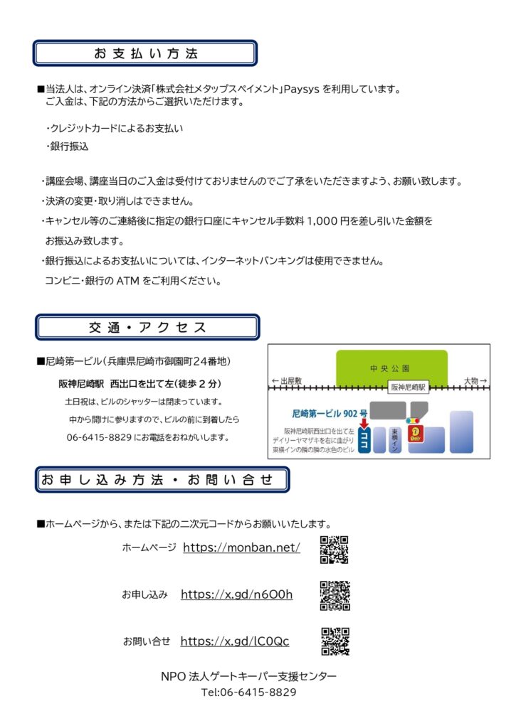 自殺危機初期介入スキルワークショップ 2026 1/24 その他 2026年1月24日 日時 5/24(日) 9:30~17:00 場所 NPO法人ゲートキーパー支援センター尼崎事務所 参加費 12,000円(カラーテキスト代・消費税含む 主催 登録団体・個人 NPO法人ゲートキーパー支援センター お問い合わせ先 TEL : 06-6415-8829 HP : https://monban.net/ その他 シェアする URLをコピーしました! 自分のための心理学講座 第2クール はじめてのNPO法人オンライン申請講座~アカウント登録から書類提出まで~