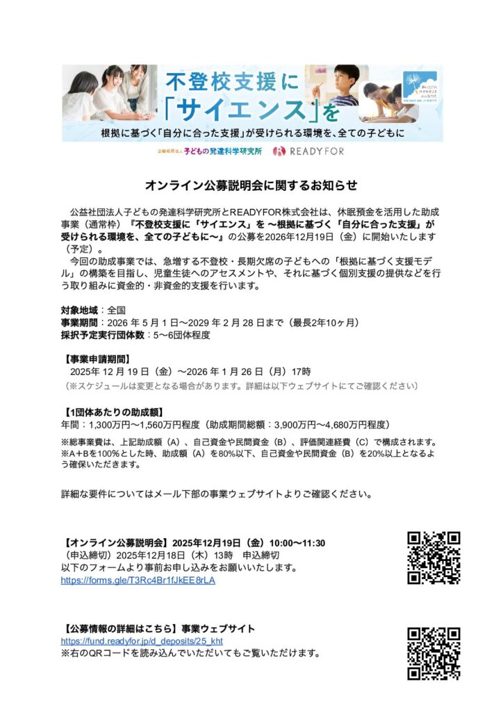 急増する不登校・長期欠席の子どもへの「根拠に基づく支援モデル」の構築を目指し、児童生徒へのアセスメントや、それに基づく個別支援の提供などを行う取り組みに資金...募集期間 2025年 12 月 19 日(金)〜2026 年 1 月 26 日(月)17時 対象 - 地域 全国分野 福祉・子ども支援分野 青少年育成・教育分野 -