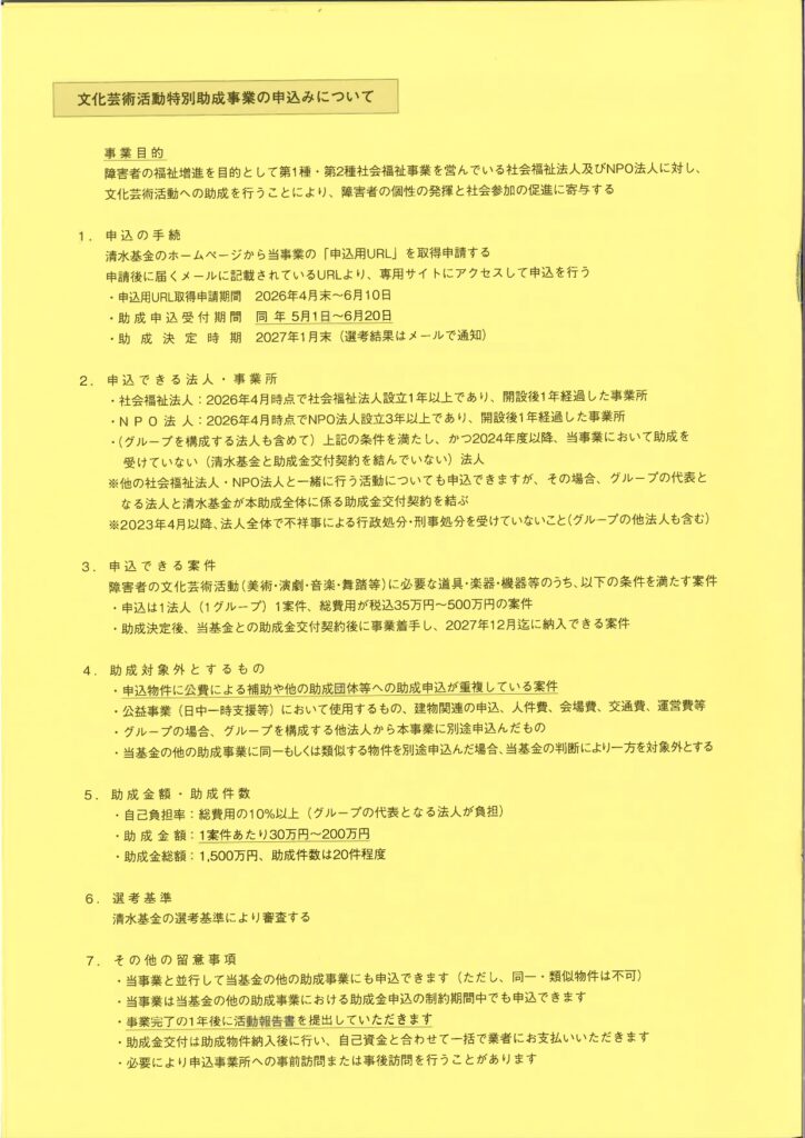 障害者の福祉増進を目的として第1種・第2種社会福祉事業を営んでいる社会福祉法人及びNPO法人に対し、文化芸術活動への助成を行うことにより、障害者の個性の発揮と社会...